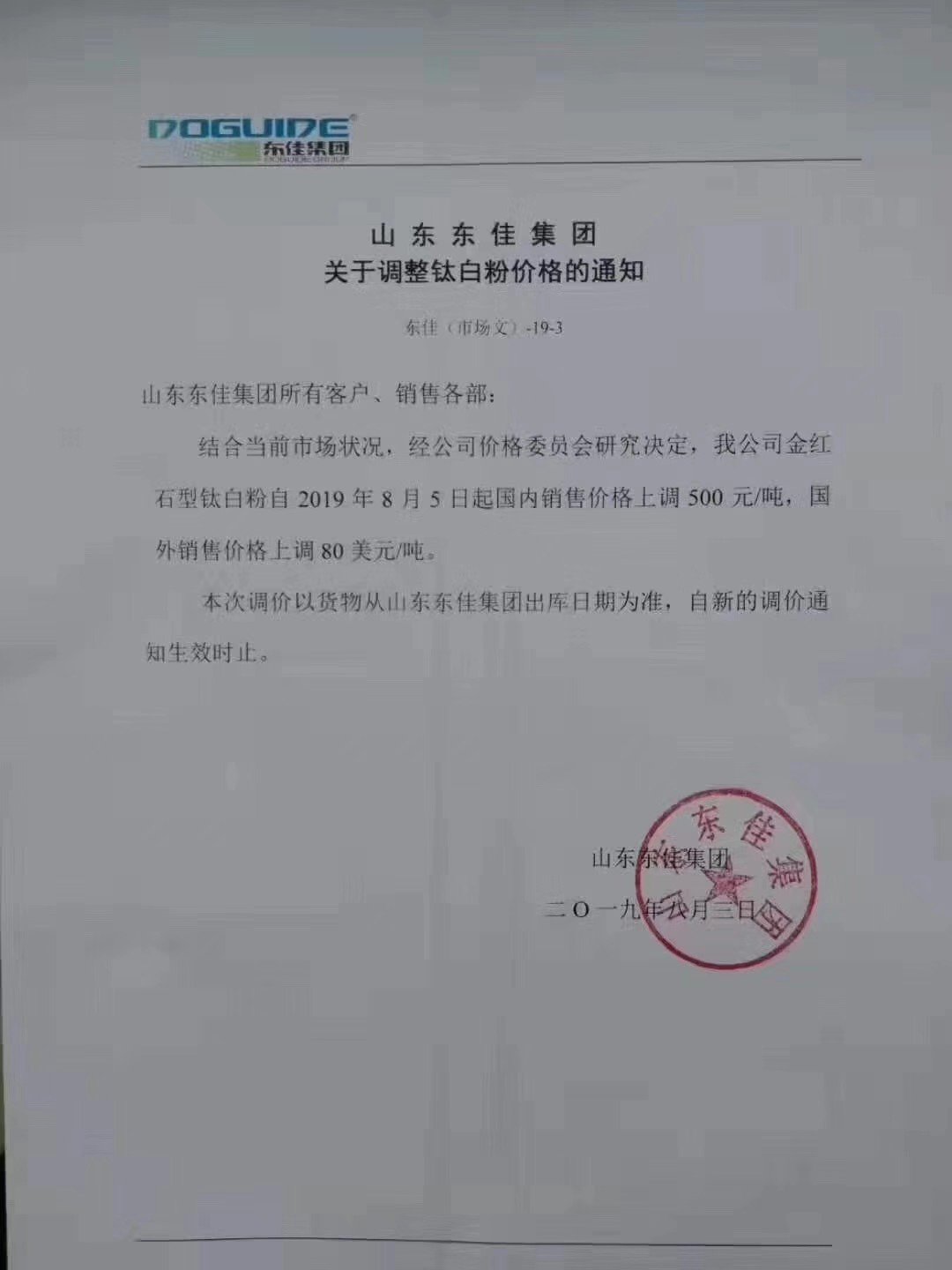 8月3日,山東東佳集團發(fā)布調(diào)整鈦白粉價格通知稱,結(jié)合當(dāng)前市場狀況,經(jīng)公司價格委員會研究決定,我公司金紅石型鈦白粉自2019年8月5日起國內(nèi)銷售價格上調(diào)500元/噸,國外銷售價格上調(diào)80美元/噸。