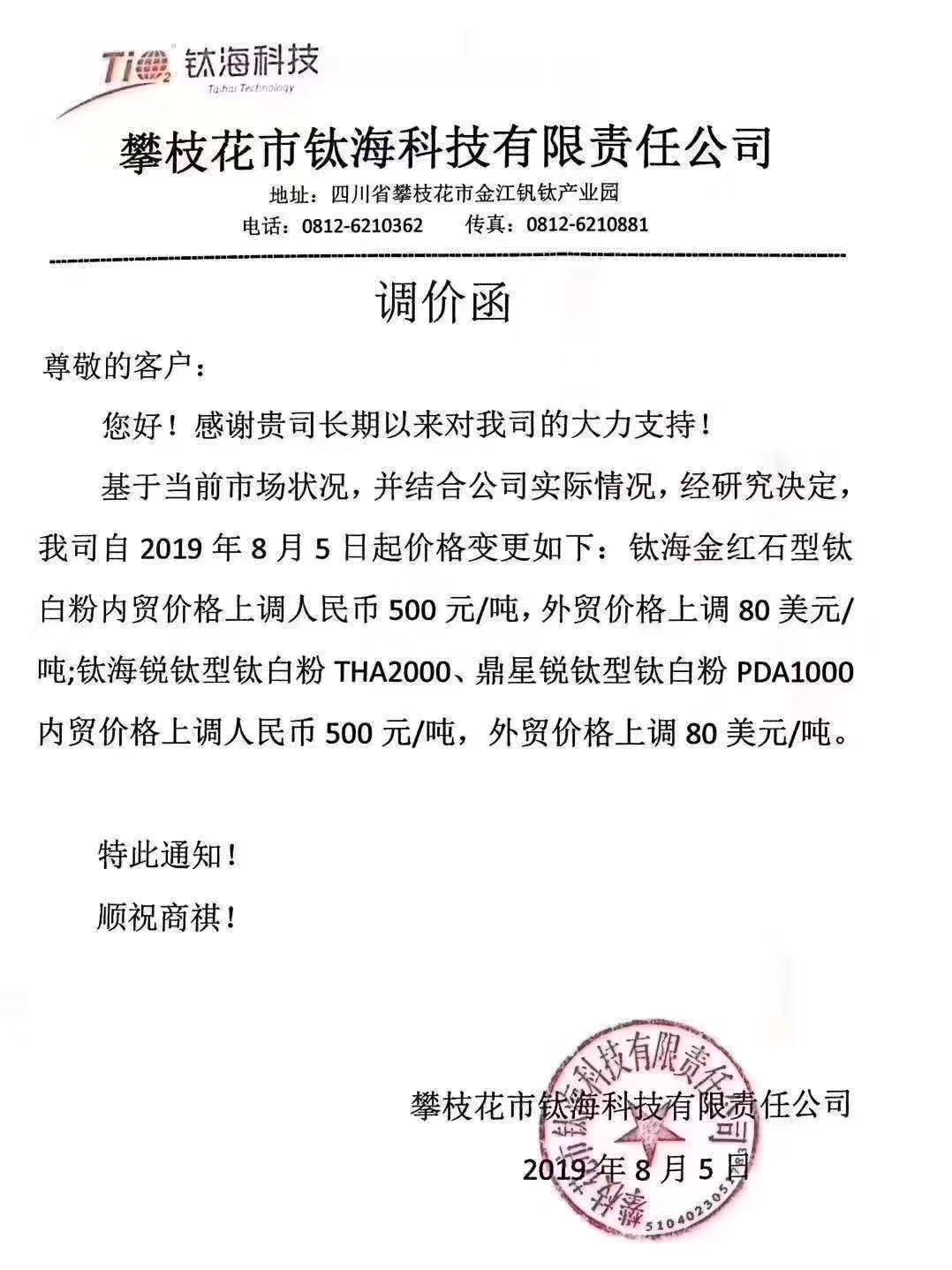 8月5日,攀枝花市鈦海科技有限責(zé)任公司發(fā)布調(diào)價函稱,基于當(dāng)前市場狀況并結(jié)合公司實際情況,經(jīng)研究決定,我司自2019年8月5日起價格變更如下:鈦海金紅石型鈦白粉內(nèi)貿(mào)價格上調(diào)人民幣500元/噸,外貿(mào)價格上調(diào)80美元/噸;鈦海銳鈦型鈦白粉THA2000、鼎星銳鈦型鈦白粉PDA1000內(nèi)貿(mào)價格上調(diào)人民幣500元/噸,外貿(mào)價格上調(diào)80美元/噸。