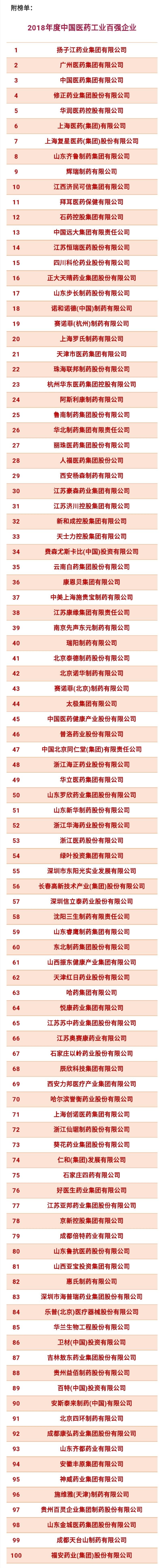 中國粉體網訊 8月25日,由中國醫藥工業信息中心主辦的2019年(第36屆)全國醫藥工業信息年會在連云港開幕,大會發布了2018年度中國醫藥工業百強企業榜單。與上一年度榜單相比,揚子江藥業集團有限公司與廣州醫藥集團有限公司繼續領跑榜單,蟬聯冠亞軍,而中國醫藥集團有限公司擠掉修正藥業,強勢躋身前三。