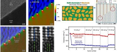 球差校正透射電鏡的觀測為解決這一問題提供了新思路。研究人員在使用電鏡研究鈣鈦礦結構固態(tài)電解質Li0.33La0.56TiO3時,發(fā)現(xiàn)富鋰層狀氧化物這一高性能電極材料的結構可以與鈣鈦礦這一被廣泛研究的固態(tài)電解質的結構間形成外延生長的界面,從而在原子尺度形成緊密、充分的固-固接觸。研究者進一步對兩者間外延界面進行深入分析,發(fā)現(xiàn)界面處每15個原子面就會形成一個錯配位錯,釋放積累的應變。這一機制導致了此外延界面的形成并不要求電極和電解質具備相近的晶格尺寸,而是可以廣泛發(fā)生于多種層狀結構材料與鈣鈦礦結構材料體系之間。隨后,研究人員將這一結論用于實際的材料制備中,以層狀電極材料0.54Li2TiO3-0.46LiTiO2晶體為模板將非晶Li0.33La0.56TiO3進行結晶制備出了原子級界面結合的電極-電解質復合正極材料,并對其進行了性能表征。結果顯示此方法制備的固-固復合電極中活性物質與電解質之間結合充分程度接近固-液接觸,并且其倍率性能也不亞于傳統(tǒng)漿料涂覆技術制備的固-液復合物電極。該方法的提出為克服固態(tài)電池中電極-電解質接觸差這一瓶頸提供了新思路。