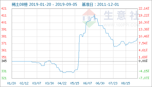中國粉體網訊 9月5日稀土指數為379點,較昨日上升了2點,較周期內最高點1000點(2011-12-06)下降了62.10%,較2015年09月13日最低點271點上漲了39.85%。(注:周期指2011-12-01至今)。