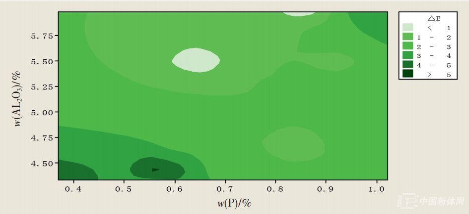 圖2 磷鋯包膜樣品△E與包膜劑含量的等值線圖
