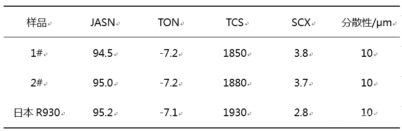 ZrO2/Al2O3包膜后的TiO2顏料特性值如表1所示。顏料特性值符合基本要求,且部分指標達到日本R930標樣水平。