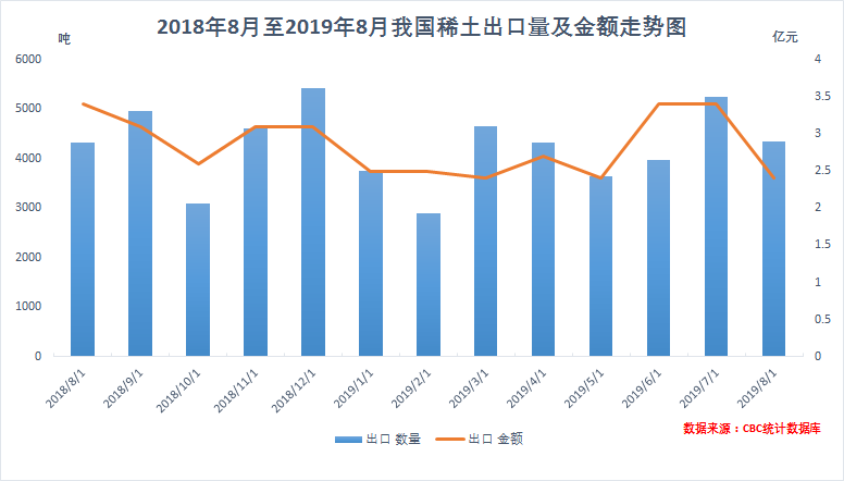 2019年8月份稀土出口金額2.4億元人民幣,環比減少29.41%,而1-8月份累計出口金額21.8億元人民幣,累計與2018年同期相比減少1.4%。