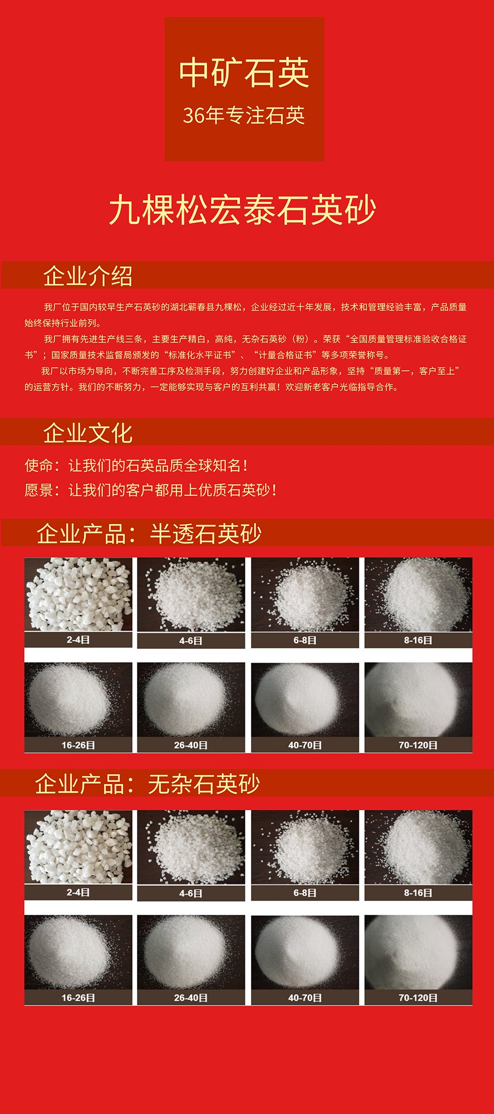 我廠位于國內較早生產石英砂的湖北蘄春縣九棵松,企業經過近十年發展,技術和管理經驗豐富,產品質量始終保持行業前列。