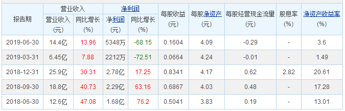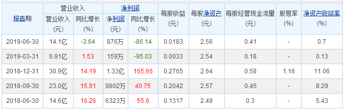 永東股份中報顯示,2019年半年度實現營業收入人民幣1435901984.70元,較上年同期增長13.96%;歸屬于上市公司股東的凈利潤53475699.46元,較上年同期下降68.15%。