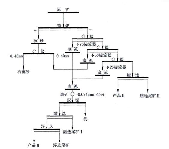 來(lái)自武漢理工大學(xué)的王浩曾在《砂質(zhì)高嶺土的工藝礦物學(xué)及選礦試驗(yàn)研究》中總結(jié)出:高嶺土選礦中提純中搗漿適宜的工藝條件為:搗漿濃度為60%,搗漿時(shí)間為20min,分散劑用量為2kg/t。經(jīng)過(guò)搗漿除砂后,調(diào)節(jié)礦漿濃度為24%φ75、φ50、φ25水力旋流器分級(jí)提純。對(duì)高嶺土選礦提純過(guò)程中的尾砂進(jìn)行綜合利用,部分石英砂作建筑用砂。