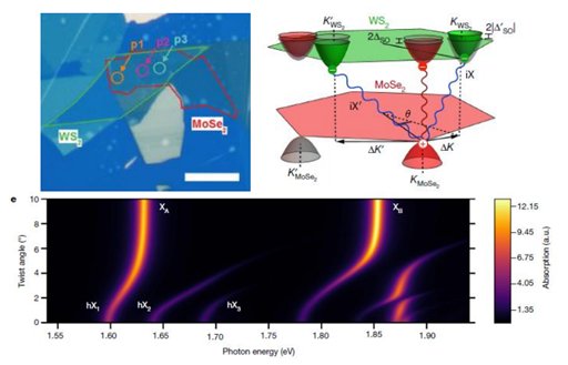 圖2 MoSe2和WS2異質(zhì)結(jié)樣品;MoSe2和WS2能帶結(jié)構(gòu)與布里淵區(qū)對(duì)準(zhǔn);吸收譜與轉(zhuǎn)角的關(guān)系。