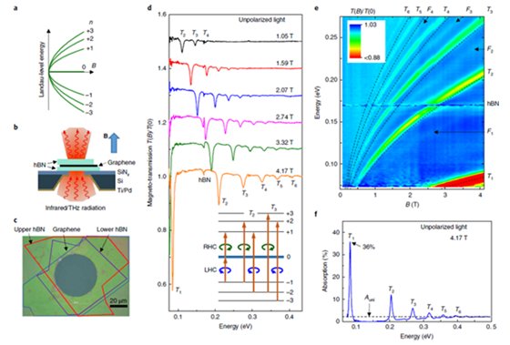 該文章中,研究人員自制磁-紅外顯微光譜測(cè)量系統(tǒng),使用高遷移率h-BN包覆石墨烯樣品,測(cè)量磁傳輸與法拉第旋轉(zhuǎn)。研究發(fā)現(xiàn)在紅外和太赫茲段出現(xiàn)強(qiáng)烈的磁光活動(dòng),包括吸收接近50%這個(gè)極限、100%磁圓形二項(xiàng)色性和高法拉第旋轉(zhuǎn)。該發(fā)現(xiàn)證明2D狄拉克材料通過(guò)磁調(diào)諧在長(zhǎng)波長(zhǎng)光電器件和等離激元器件中的應(yīng)用潛力。