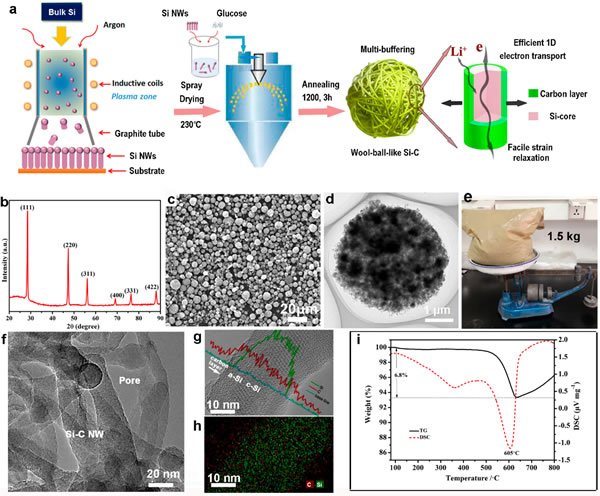 副研究員侯果林介紹,在研究等離子體制備納米硅時(shí)發(fā)現(xiàn),等離子反應(yīng)器中冷熱程度不同,獲得的產(chǎn)物具有不同的形貌和結(jié)構(gòu),研究團(tuán)隊(duì)通過引入熱壁反應(yīng)器,延長(zhǎng)顆粒生長(zhǎng)時(shí)間等,成功批量制備了硅納米線,并進(jìn)一步對(duì)硅納米線與碳進(jìn)行組裝,制備了多尺度緩沖的碳包覆硅納米線團(tuán)。線團(tuán)中有豐富的孔隙結(jié)構(gòu),為硅納米線在嵌鋰過程中的體積膨脹提供空間,能夠承受一定的外力而保證結(jié)構(gòu)不被破壞,與理論計(jì)算結(jié)果一致,為穩(wěn)定的循環(huán)性能提供了結(jié)構(gòu)保障。
