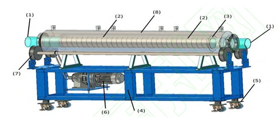 (1)石英玻璃筒;(2)螺旋狀石英玻璃擋板;(3)電加熱線圈;(4)底座;(5)升降支架;(6)旋轉電機;(7)旋轉軸承;(8)保溫層