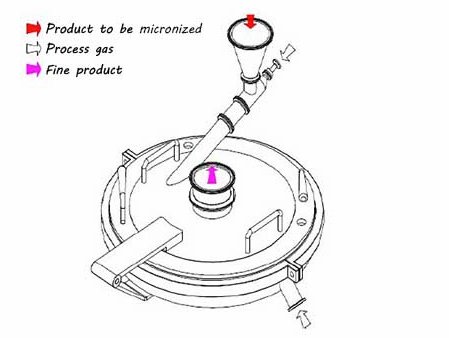 氣流粉碎機用于流體能量。以煎餅螺旋氣流粉碎機為例。微粉化和分級在淺的圓柱形腔室中進行。通過在周壁上以規則距離放置的特殊設計的噴嘴將高壓空氣或蒸汽注入該室。