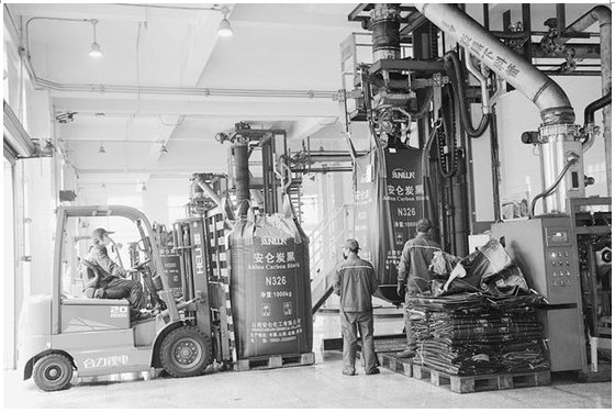 11月9日,山西安侖化工有限公司炭黑包裝車間的工人們正在作業。近年來,該公司不斷加大研發力度,擴大生產規模,增加產品種類,提高經營效益,目前已成為全球單體產能最大的炭黑生產基地。