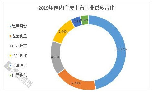 上圖為國內炭黑行業中的主要上市企業狀況,其中以炭黑為主營業務的上市企業主要是黑貓股份、龍星化工、山西永東及金能科技四家。其中江西黑貓以108萬噸的產能占據國內炭黑市場總產能的13.27%,龍星化工比重占到5.28%。而云維股份和山西焦化主要以上游煤焦油為主營,炭黑市場份額占比相對較低。