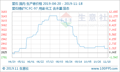 中國粉體網訊 由螢石價格走勢圖清晰看出螢石價格走勢一直維持低位,據統計截止11月18日國內螢石均價為2861.66元/噸,國內螢石價格走勢以穩為主,據統計近期國內內蒙古地區97螢石濕粉價格在2600-2900元/噸,福建地區97螢石濕粉商談主流在2700-3000元/噸,河南地區97螢石濕粉價格在2700-3000元/噸,江西地區97螢石濕粉價格在2700-2900元/噸。