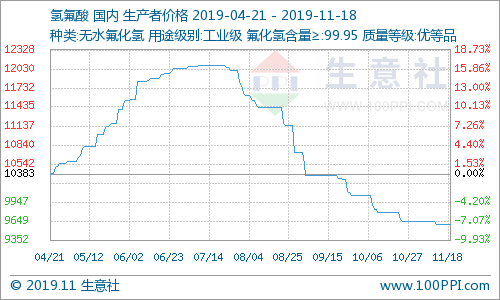 截止18日國內氫氟酸市場均價為9600元/噸,近期國內氫氟酸市場疲軟,國內福建地區氫氟酸商談主流在9000-9500元/噸,山東地區氫氟酸價格在9000-10000元/噸,江西地區氫氟酸價格在9000-9500元/噸,內蒙古地區氫氟酸市場商談在8500-9500元/噸左右,氫氟酸市場供應正常,市場價格處于低位。