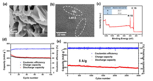 高氮摻雜微晶碳的結(jié)構(gòu)及儲(chǔ)鉀性能:(a)SEM形貌表征(b)TEM顯微結(jié)構(gòu)