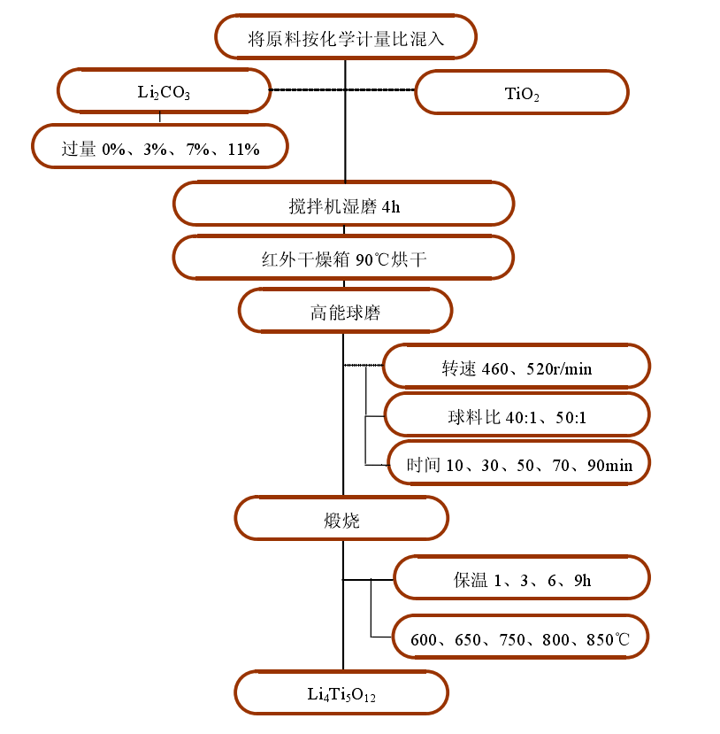 鋰鈦氧化物是電池負極材料研究的一個熱點。尖晶石型Li4Ti5O12的制備方法,主要有固相反應法、溶膠—凝膠法,從工業化實現角度考慮,固相反應法最有可能被采用。劉盛林研究了一種采用高能球磨法用途制備鋰鈦氧化物的方法,主要包括濕法預磨、高能球磨制備前軀體、高溫合成Li4Ti5O12等,具體流程如下:
