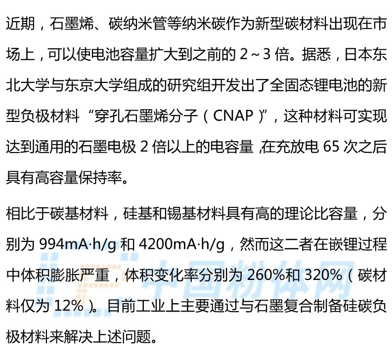 碳族的碳基、硅基和錫基材料是全固態電池另一類重要的負極材料。碳基以石墨類材料為典型代表,石墨碳具有適合于鋰離子嵌入和脫出的層狀結構,具有良好的電壓平臺,充放電效率在90%以上,然而理論容量較低(僅為372mA·h/g)是這類材料最大的不足,并且目前實際應用已經基本達到理論極限,無法滿足高能量密度的需求。