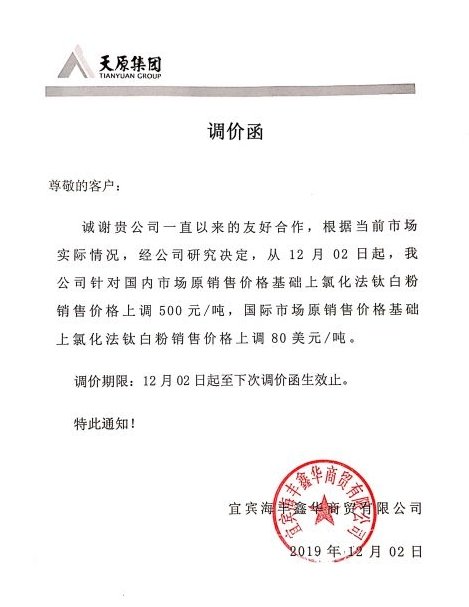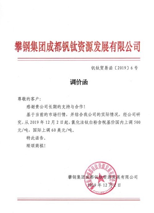 基于當前的市場行情,并結合公司實際情況,經公司研究,從2019年12月2日起,氯化法鈦白粉含稅基價國內上調500元/噸,國際上調60美元/噸。