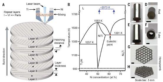 圖一:A. 粉末激光定向能量沉積技術示意圖;B. 鎳鈦合金相圖;C-H. 作為范例展示,獲得了柱狀、管狀和蜂窩狀結構;F. 等溫加載時各材料行為的對比;G. 絕熱加載時各材料行為的對比;H. 各材料的滯后特性和效率的對比。