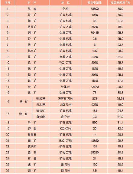 中國粉體網訊 依據中國礦產資源報告2019,截至2018年底,全國已發現173種礦產,其中,能源礦產13種,金屬礦產59種,非金屬礦產95種,水氣礦產6種。其中,2018年新增查明資源儲量鋁土礦1.16億噸,鎳礦47.20萬噸,金礦719.80噸,磷礦2.25億噸,螢石1158.30萬噸,晶質石墨5497.3萬噸。此外,中國非油氣礦產資源潛力巨大,截至2018年底,已預測固體礦產資源28種,埋深2000米以淺的平均查明率為26.0%。