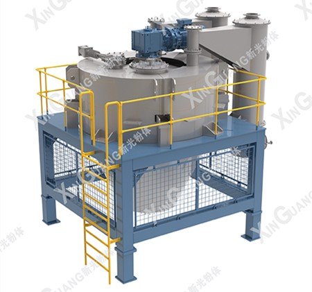 該機具有錐形混合桶體,并配有中心轉軸,轉軸上裝有沿著桶壁滑動的刀片,其刀片同轉軸有一定角度的傾斜角。轉軸高速運轉產生強離心力將產品推向桶體內壁,此時桶體的錐形體表面由于帶有傾斜角的刀片作高速運轉,使粉體產生一個沿內壁向上的運動,翻滾的動力使粉末沿內壁上升蝶形封頭蓋,再回到混合機的中心,并快速回落到桶體底部,重新開始新的一輪的混合翻滾運動,覆于桶壁的加熱板對桶壁加熱,熱量通過桶壁傳導到物料是物料能充分的混合包覆。