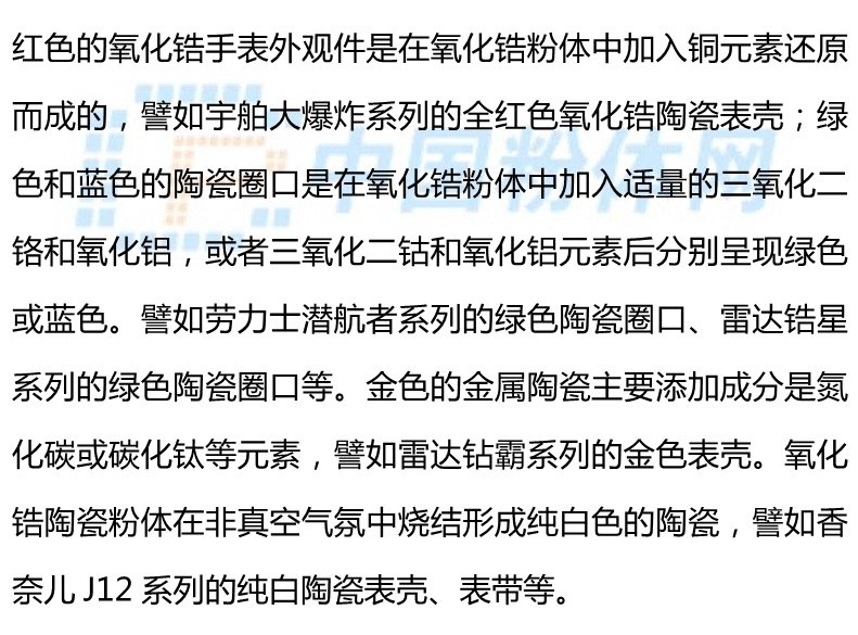 在陶瓷粉末原料中添加金屬氧化物作為著色劑,在一定溫度和氣氛中燒結后可形成具有不同顏色的彩色陶瓷材料。基于陶瓷著色劑制備方法和技術的不斷進步,彩色陶瓷的色彩越來越豐富,為陶瓷手表外觀件的多色彩提供了基礎材料技術支持。