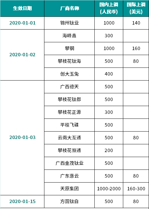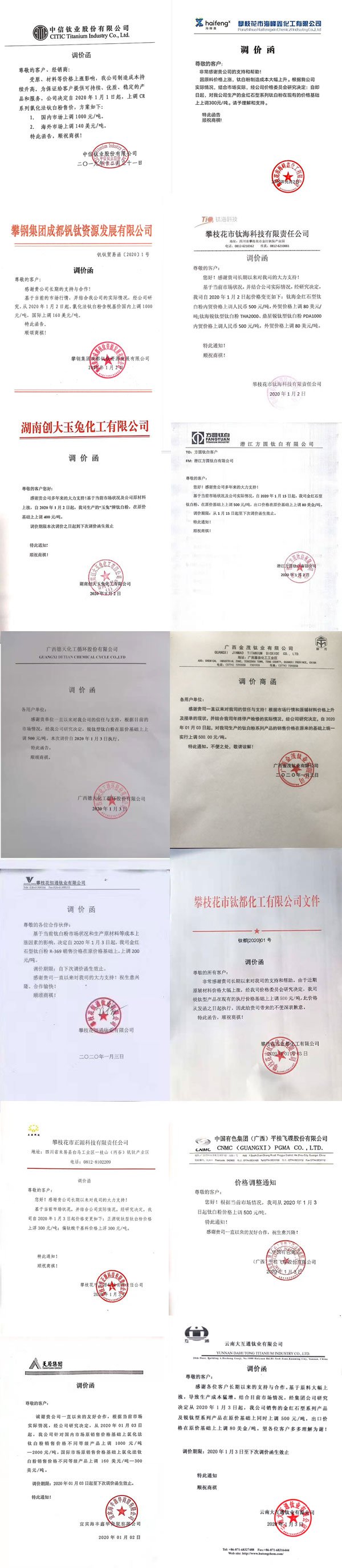 新年第一天,中信鈦業(原錦州鈦業)打響了新年漲價劇目的前奏,發布調價函。據報道,2020年1月1日,錦州鈦業宣布旗下鈦白粉提價,其國內市場上調1000元/噸,國外市場上調140美元/噸。