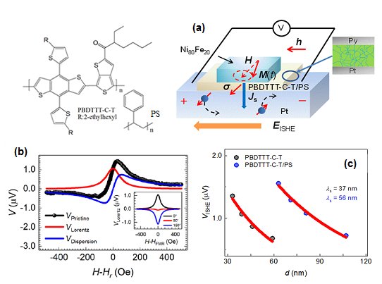 圖(a) Py/PBDTTT-C-T/Pt三明治結構器件上ISHE效應的產生,(b) 該器件所測的總電壓譜(隨磁場變化)及其退卷積。其中VLorentz對應于ISHE電壓,(c) ISHE電壓分別隨PBDTTT-C-T介質層和PBDTTT/PS共混膜介質層厚度的變化。由此推算出聚合物薄膜不同的自旋擴散長度ls。