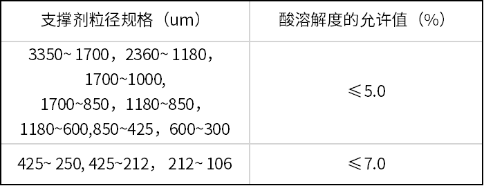 各種粒徑規(guī)格支撐劑允許的酸溶解度值見(jiàn)表1。值得注意的是,石英砂和陶粒支撐劑的酸溶解度指標(biāo)相同。