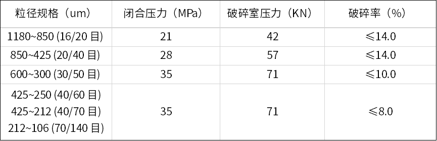 其適用的粒徑規(guī)格、規(guī)定閉合壓力與破碎率指標(biāo)見(jiàn)表2。