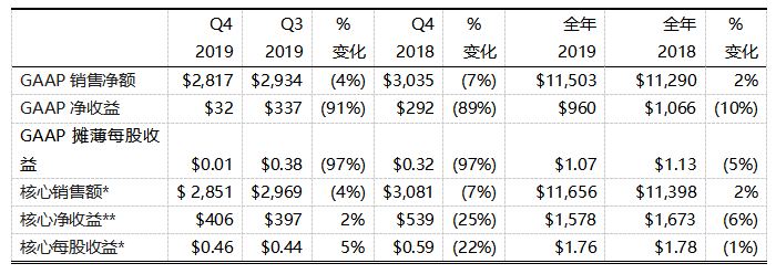 · 第四季度GAAP銷售額28.2億美元,核心銷售額28.5億美元;全年GAAP銷售額115億美元,核心銷售額117億美元。