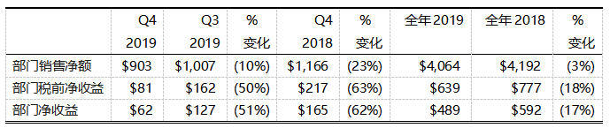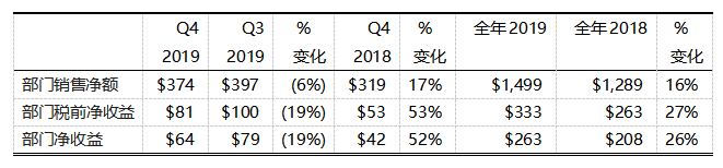 特殊材料部2019年全年銷售額符合預期。得益于創(chuàng)新產(chǎn)品的研發(fā)以及市場對高端玻璃的強勁需求,其全年銷售額同比增長8%。第四季度銷售額為4.53億美元,與2018年第四季度相比增長14%。