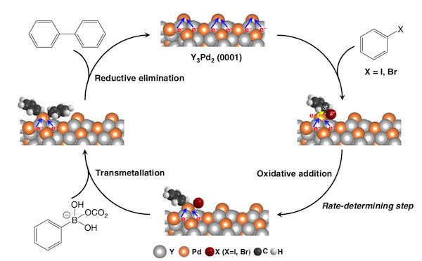 據(jù)文章第一研究作者東京理工大學(xué)元素策略材料研究中心助理教授葉天南解釋說,根據(jù)理論計(jì)算,Y3Pd2被認(rèn)為是有效的選擇。他說:“在一種電子化合物中,陰離子電子被困在間隙位置,通常具有很強(qiáng)的電子捐贈(zèng)作用。這一特征促使我們將Y3Pd2作為鈴木偶聯(lián)反應(yīng)催化劑,因?yàn)闆Q速步驟的反應(yīng)勢壘可通過電子從駐極體轉(zhuǎn)移到基板來抑制!