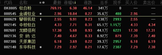 受近期鈦白粉即將漲價(jià)消息的影響,鈦白粉板塊強(qiáng)勢崛起,周五收漲6.29%,漲幅位居所有板塊第一。板塊內(nèi)個(gè)股漲幅都超過2%,攀鋼釩鈦、金浦鈦業(yè)漲停,中核鈦白收漲7.71%,龍蟒佰利收漲5.68%。