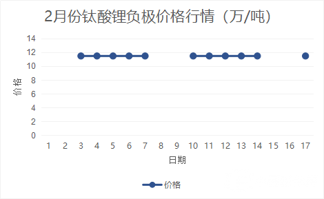 2月份上半月鈦酸鋰價(jià)格維持穩(wěn)定,市場價(jià)格無大幅度變化,平均價(jià)格維持在11.5萬元/噸。