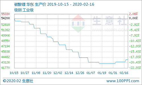 產品:根據生意社價格監測,本周碳酸鋰市場以維穩運行為主,部分企業報價上調。這次上漲的主要原因是目前庫存較低,但市場需求大。加之受疫情影響,物流方面成本上漲。截止2月16日,工業級碳酸鋰華東地區均價價格為43900元/噸,與周初相比上漲1.39%。2月16日電池級碳酸鋰華東地區均價價格為51200元/噸,與周初相比上漲0.79%。