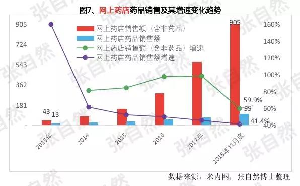 網上銷售處方藥一直較謹慎,發展也不快,網上藥店藥品的銷售僅由2013年的13億上升到2018年11月底的99億元,而同期網上藥店整體的銷售額則由2013年的43億元迅速增長到2018年11月底的905億元(圖7)。
