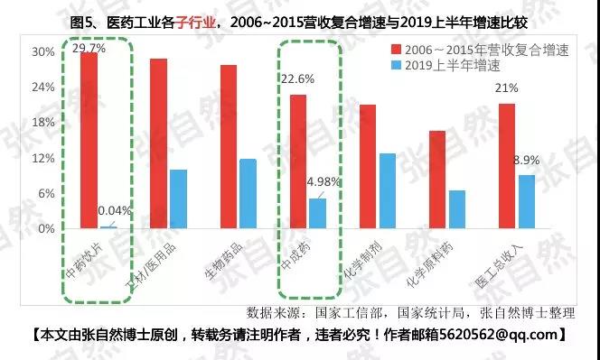 實際上,盡管頒布了《中醫藥法》,高層也大力提倡,但這幾年中藥產業的營收表現非常不樂觀,和醫藥工業其他子行業對比,中成藥和中藥飲片一直是發展最快的,如2006-2015年連續10年的復合增長率,中藥飲片獨占鰲頭為29.7%,中成藥也高于行業平均水平的21%達22.6%,而到了2019年上半年,中藥飲片的營收增速僅為0.04%,中成藥增速也已遠遠落后于行業平均的8.9%,僅為4.98%(圖5)。