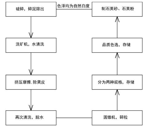 摘要:本申請公開了一種石英砂無酸洗除黃皮工藝,其步驟包括將原礦石英石通過破碎機破碎成碎塊,碎泥篩出;于洗礦機注入清水來除泥;將除泥后的石英石碎塊輸入第二臺擠壓式滾筒洗礦機,加入清水擠壓清洗,擠掉外表面至少80%的黃皮;再次清洗并進行脫水;將脫水后的石英石碎塊進行粉碎;用振動篩分篩分類,分成第一種規格與第二種規格并且各自分別儲存于不銹鋼料倉內;兩種規格的石英石碎粒進行色選;根據不同需求,分別制出精品石英砂,制出石英粉。本發明在不采用任何酸洗的條件下能夠有效去除石英石原礦外表面的黃皮,確保生產出穩定性較強且品質較佳的原礦石,能夠體現出石英石原礦的自然白度,并且其加工生產過程不會對環境帶來危害。