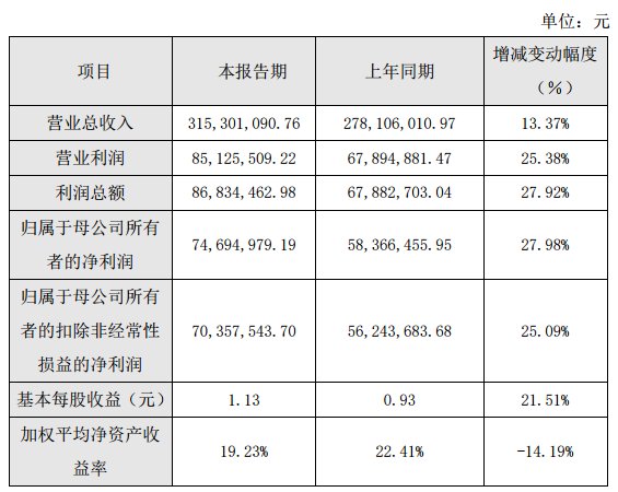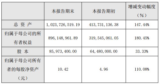 據了解,報告期內,公司實現營業收入 315,301,090.76 元,同比增長 13.37%;實現利潤總額 86,834,462.98 元,同比增長 27.92%;實現歸屬于母公司所有者的凈利潤 74,694,979.19 元,同比增長 27.98%;報告期末總資產 1,023,726,519.19元,較期初增長 147.44%;歸屬于母公司的所有者權益 896,148,961.89 元,較期初增長 180.45%。