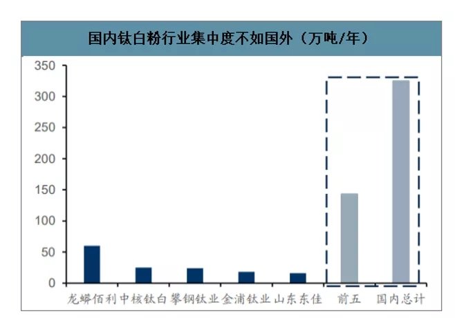 盡管近幾年在行業競爭和環保督察雙重壓力下,小產能逐步退出,國內鈦白粉產業集中度逐步提升,但是相比較于國際行業格局,集中度依然較低。我國鈦白粉主要集中在華中、西北和西南地區,行業前十企業產能占比僅達到55%。