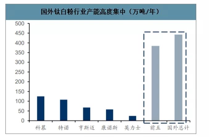 國外鈦白粉行業產能高度集中,呈現寡頭壟斷局面。國外鈦白粉行業前五的企業分別為:科慕、特諾、Venator、康諾斯和英力士,總產能達到382.5萬噸,占到海外總產能的87%。