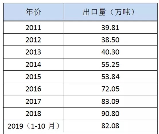 國內鈦白粉價格優勢明顯,出口多以低端硫酸法為主。國外鈦白粉巨頭多使用氯化法生產鈦白粉,國內出口的鈦白粉多是硫酸法生產的銳鈦型鈦白粉,售價要遠低于國外。我國鈦白粉出口總量大體呈逐年遞增態勢,2018年的出口量更高達90.80萬噸,占當年全國總產量的30.73%。2019年10月我國鈦白粉出口量為7.94萬噸,環比減少5.26%,同比增加26.08%。2019年1-10月鈦白粉累計出口量為82.08萬噸,同比增加5.82%。預計2019年全年出口總量或空前的破百萬噸。