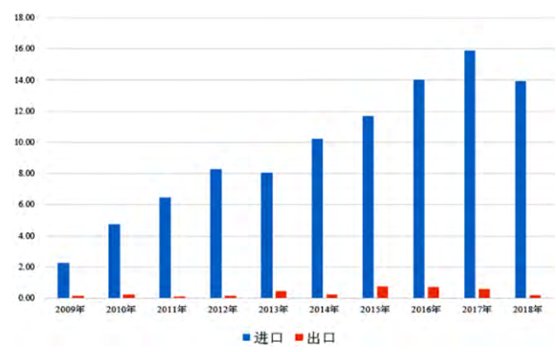 2009—2018年我國含硅量≥99.99%的硅(HS28046190)進、出口量統(tǒng)計(萬t)