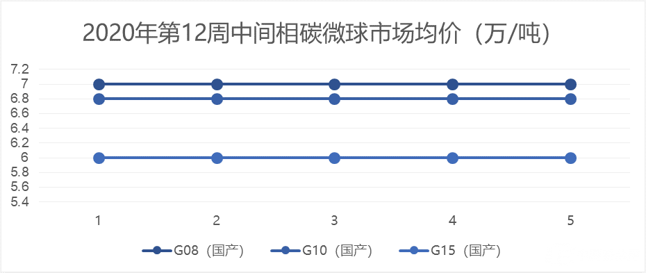 第12周中間相碳微球市場報價與上周價格持平,具體均價:G08(國產)均價7萬/噸,G10(國產)均價6.8萬/噸,G15(國產)均價6萬/噸。