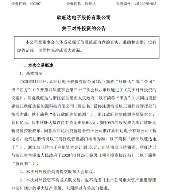 從協議內容來看,由欣旺達與浙江省蘭溪市人民政府將共同出資新建浙江欣旺達新能源科技有限公司(暫定名,以下簡稱“浙江欣旺達新能源”),注冊資本金計劃10億元,其中欣旺達擬以自有資金出資6億元控股60%,是浙江欣旺達新能源控股股東。