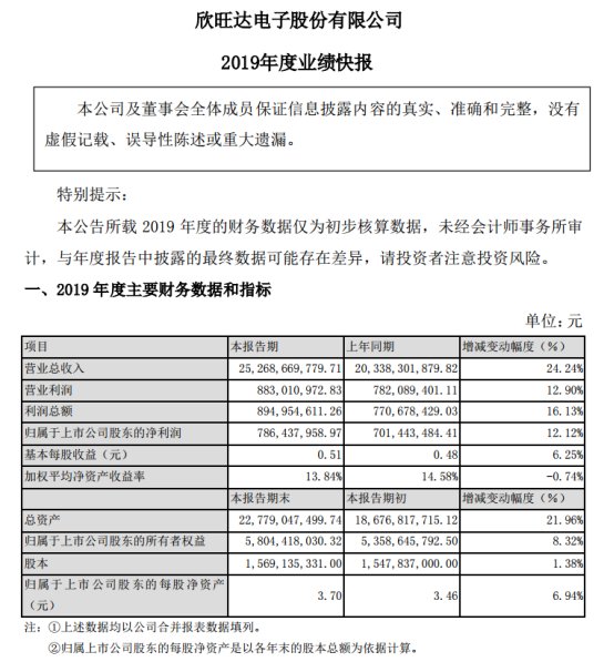 2月28日晚,欣旺達披露2019年業績快報。2019年度,欣旺達實現營業收入2,526,866.98萬元,比上年同期增長24.24%;利潤總額 89,495.46 萬元,比上年同期增長 16.13%;實現歸屬于上市公司股東的凈利潤 78,643.80 萬元,比上年同期增長 12.12%。