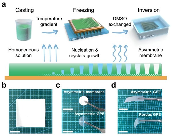圖2.(a)非對(duì)稱(chēng)聚合物膜制備示意圖。(b-d)非對(duì)稱(chēng)聚合物膜GPE實(shí)物圖。